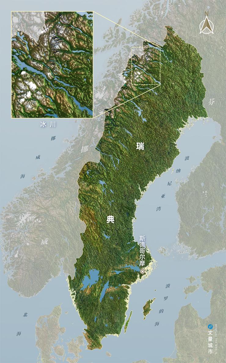 瑞典位于斯堪的纳维亚半岛,64%的国土被森林覆盖,84%的人口居住在只占国土面积1.3%的城市内。