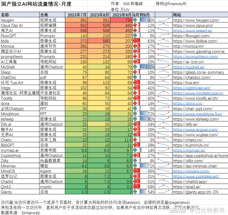 与诗云马良在国内的反响不温不火相反,Heygen 从 2022 年 7 月推出后用了 178 天就达到 100 万美元的 ARR,217 天达到“拉面盈利”状态。虽然官方没有披露最新数据,但从网站访问情况看,Heygen 在 9 月份的访问量同比暴增 92%,位居国内出海 AI 产品榜首位,相信营收数据应该也会大幅增加。