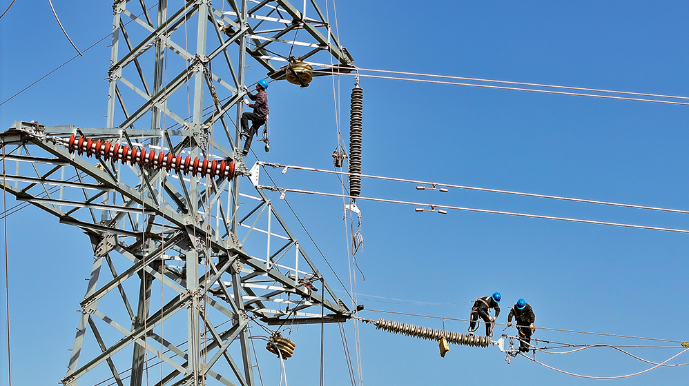 2023年9月21日,河北张家口,在经济技术开发区境内的洋河新区输电线路改造工程现场,施工人员在高空进行电力导线紧固。视觉中国 资料图