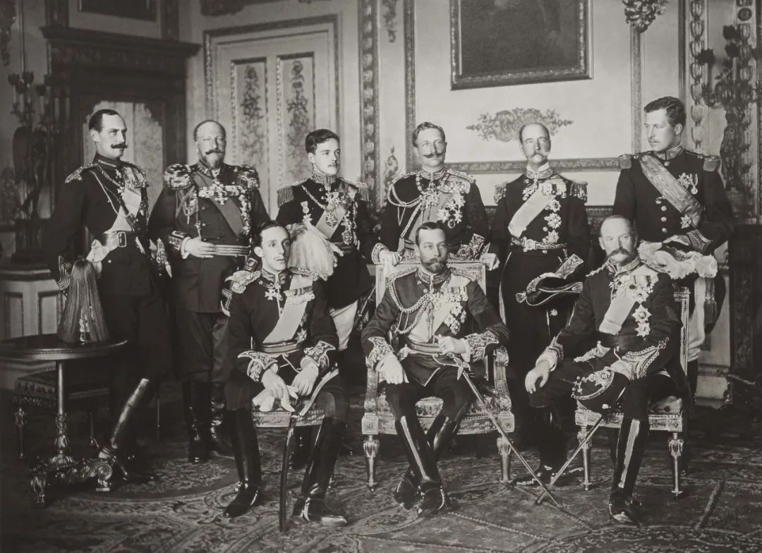 在随后的十二辆国务车中,乘坐着至少七位王后。与她们在一起的还有各种各样的公主、王妃、王室的女公爵、公爵夫人,以及英国新任君主乔治国王和玛丽王后(Queen Mary)的年幼的子女。看着这些皇室成员辚辚而过,谁会对君主制的兴盛蓬勃存有怀疑呢?事实上,没有什么能比这支招摇的队伍更能象征20世纪初欧洲君主制的非凡发展了。而且,除了别具异国情调的东方王子们之外,这些皇室成员大多是有亲戚关系的。已故的爱德华七世被称为“欧洲的舅舅”:如果欧洲哪个国家的国王和王后不叫他舅舅或叔叔,那他们一定是他的表亲或姻亲,可能隔了数个辈分。几乎欧洲大陆的每个宫廷都夸耀自己至少有一名成员是爱德华七世的科堡坠落的王冠(Coburg)家族一脉的亲戚。