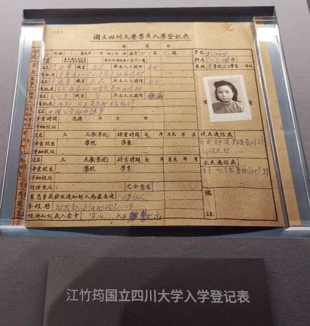 江竹筠国立四川大学入学登记表(蓬州闲士摄于自贡市江姐故里红色教育基地,图片来源:四川方志图库)