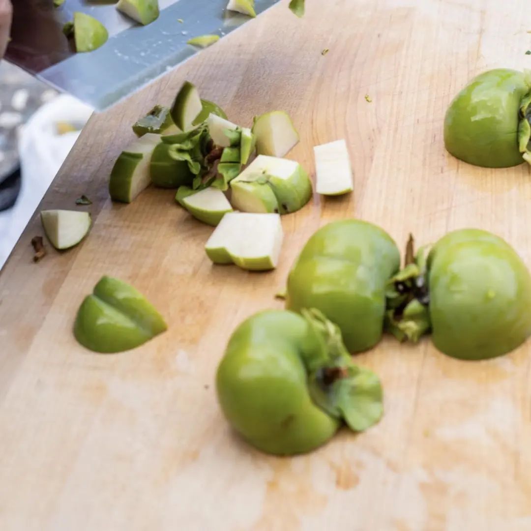 1. 将青柿子去掉叶子,将果实切碎,放入搅拌机中打成泥状;