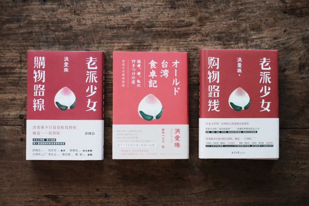 洪爱珠:因应题目,开始就打算用大红色底,字体也要大,参考从前的广告字体做的。我的书开本又比一般的书小,因此希望它小而精干。寿桃是一种很老派东方的食物,通常出现在喜庆场合。比如神明生日或是寿宴,总之喜气。