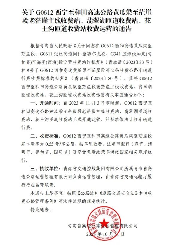 根据青海省人民政府《关于同意在G0612西和高速黄瓜梁至茫崖段、G0611张汶高速同仁至赛尔龙段、G341胶海线加定(青甘界)至海晏(西海)段设置收费站的批复》(青政函〔2023〕33号)和《关于G0612西和高速黄瓜梁至茫崖段等2条收费公路车辆通行费收费标准的批复》(青政函〔2023〕80号),现将G0612西宁至和田高速公路黄瓜梁至茫崖段老茫崖主线收费站、翡翠湖匝道收费站、花土沟匝道收费站收费运营有关事宜通告如下: