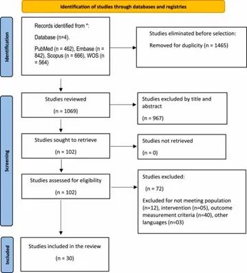 研究者从各大数据库检索到的共2534篇相关文献,其中包括PubMed的462篇,Embase的842篇,Scopus的666篇,以及Web of Science的564篇。经过去重后,筛选团队剔除了1465篇文章。在对剩下的1069篇文章的标题和摘要进行初步审查后,研究者选取了102篇进入全文审查阶段。最终,30篇文章被纳入了本次系统性审查(见下图)。