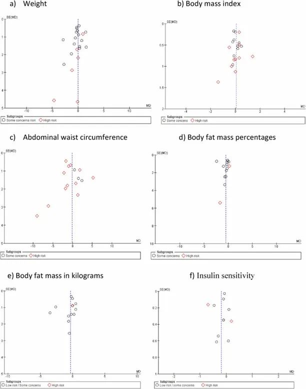 使用GRADE方法,评估团队对六个结果进行了确定性评估。其中,与体重、体质指数、胰岛素敏感性、体脂百分比和体脂质量相关的结果的确定性为中等。但对于腹部腰围,其确定性被评定为低。