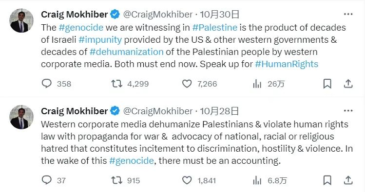 莫基贝尔接着指出,西方媒体进一步强化了这一“掩护”。他说,“这些媒体公然违反《公民权利和政治权利国际公约》,不断地非人化巴勒斯坦人,并宣传战争和鼓吹民族、种族或宗教仇恨以促进种族灭绝,构成了煽动歧视、敌意和暴力。美国的社交媒体公司压制人权捍卫者的声音,同时扩大亲以色列的宣传。以色列游说团体正在骚扰和抹黑人权捍卫者,西方大学和雇主还与他们合作,惩罚那些敢于公开反对暴行的人。在这场种族灭绝之后,必须对这些人进行追责。”他在自己的X账号(原推特)上发表了同样的观点。