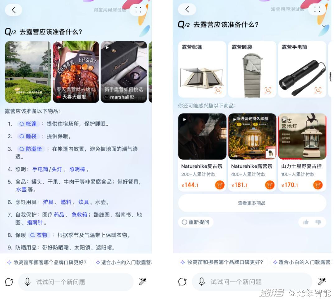例如,用户在淘宝问问上提问“去露营应该准备什么?”,AI会迅速给出文字解答、视频介绍、商品链接,用户还能通过点击文字超链接或者搜索图片进入二级购物页面。回答末尾还附上了3个相关推荐选项卡,点击进入店铺商品详情页,即可直接购买。