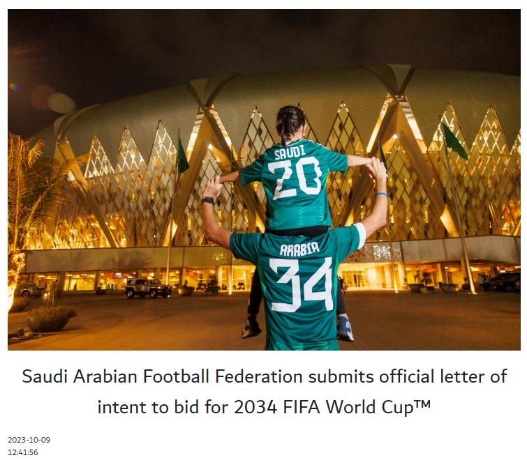 国际足联10月31日宣布,沙特阿拉伯足协是截止日期前唯一提交2034年足球世界杯举办申请的足协。