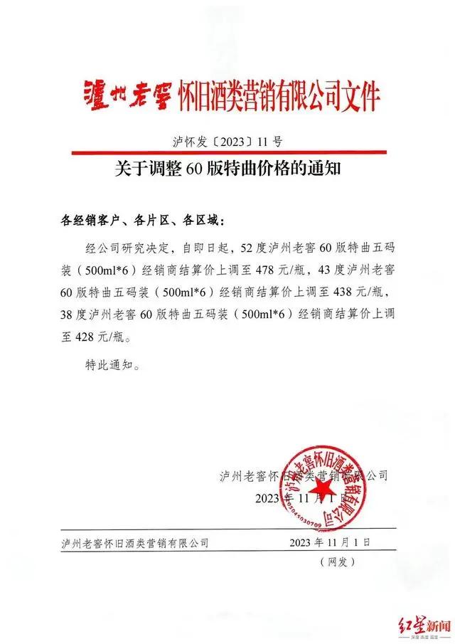 据报道,泸州老窖11月1日调价特曲产品。通知文件显示,52度泸州老窖60版特曲五码装(500ml×6)经销商结算价上调至478元/瓶,43度泸州老窖60版特曲五码装(500ml×6)经销商结算价上调至438元/瓶,38度泸州老窖60版特曲五码装(500ml×6)经销商结算价上调至428元/瓶。
