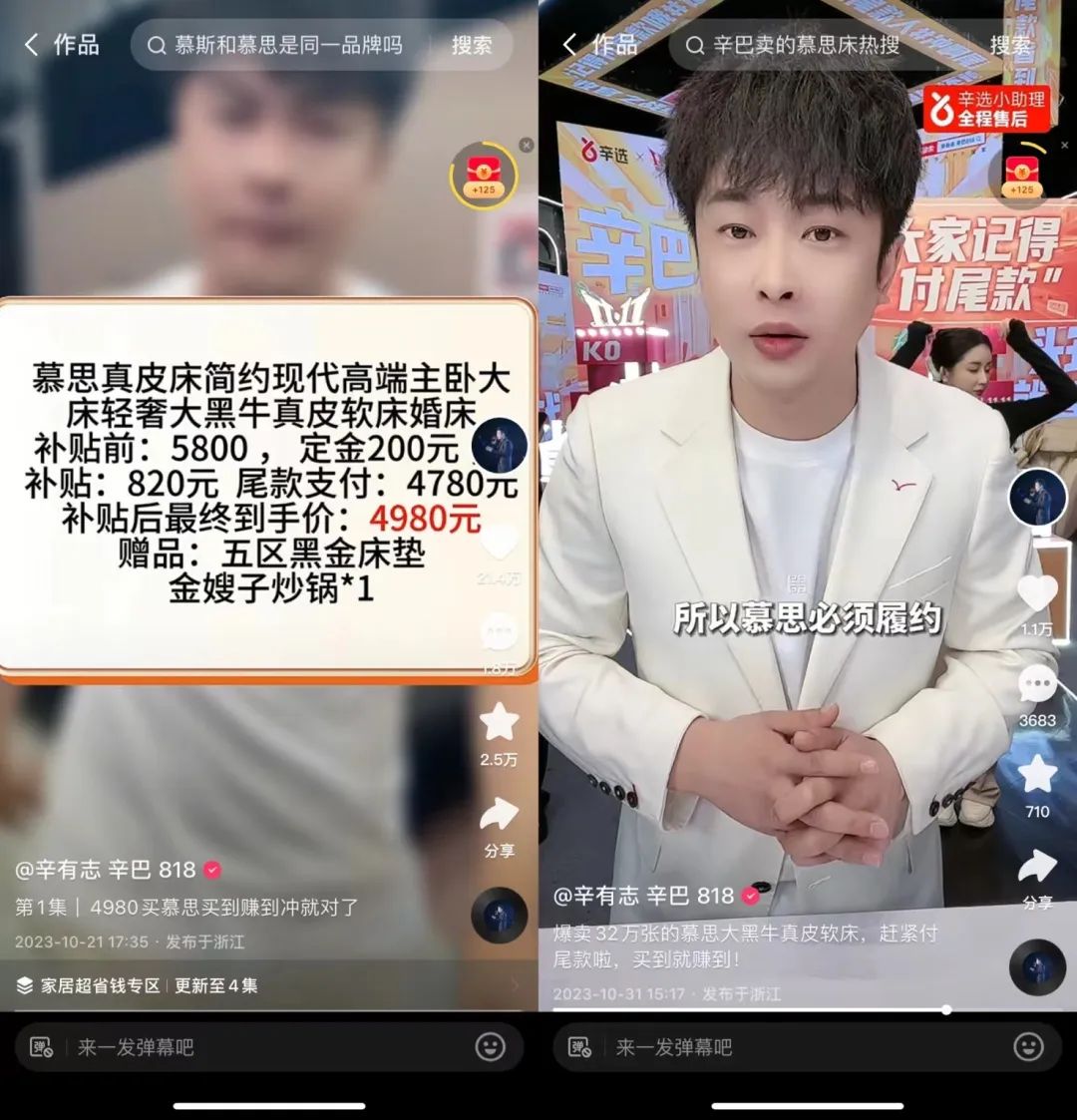 十月下旬,家居品牌慕思与快手主播辛巴合作推广一款“大黑牛”软床产品。辛巴表示,这款产品由快手补贴820元、自己让利近1000元佣金,最终到手价4980元/套还赠送一款“黑金”床垫。在日前的直播活动中,辛巴方透露称,已付定金的产品销售量达到19.4万张,预估最终销售额超过10.09亿元。据10月31日辛巴发布的视频,已付定金的产品销量已达到32万张——十几亿上下的订单对于慕思这样主营线下的品牌而言,无疑是影响巨大的。