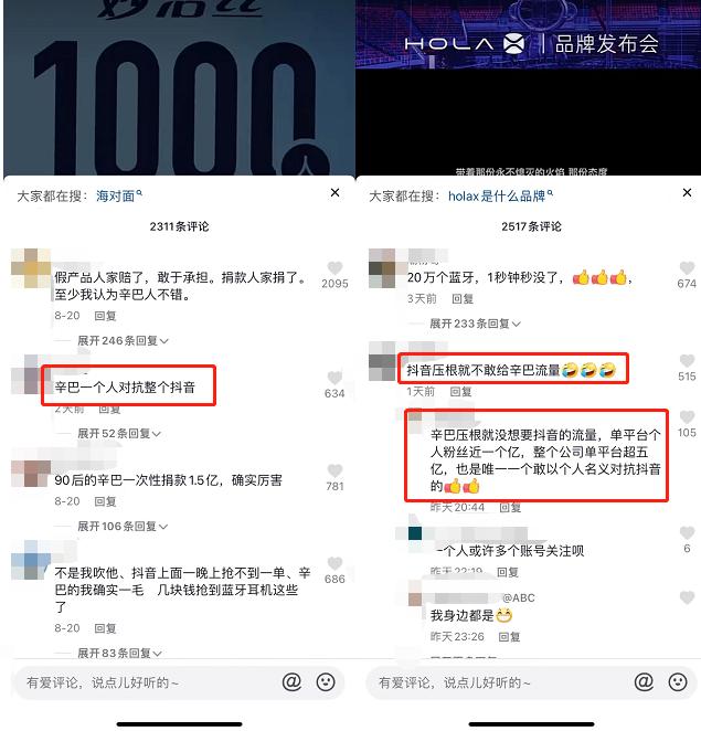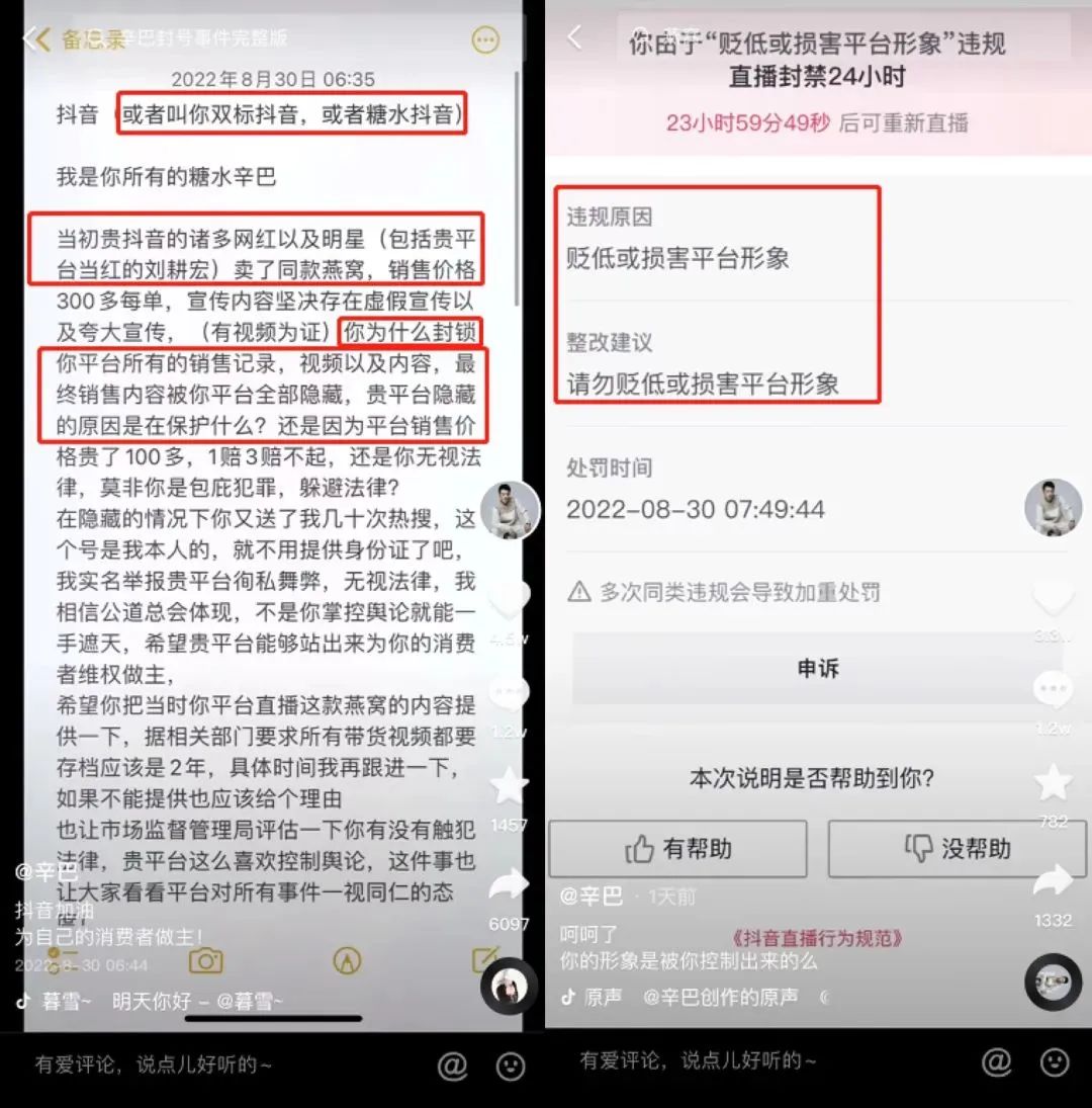 辛巴最为高调的一次出圈,要回溯到去年8月。他怒斥抖音双标,并爆料刘畊宏等诸多抖音网红售卖同款糖水燕窝。他在长文中质问抖音,“你为什么封锁你平台所有的销售记录,视频以及内容,最终销售内容被你平台全部隐藏,贵平台隐藏的原因是在保护什么?”随后辛巴的账号被官方封禁,24小时后才能复播,给出的原因是“涉嫌贬低与损害平台形象”。在当时,一部分网友认为平台应该一视同仁、严查售假问题;也有人观点提出称,这只是辛巴和其他大主播之间的争斗,“自己淋过雨,所以要把别人的伞扯烂”。