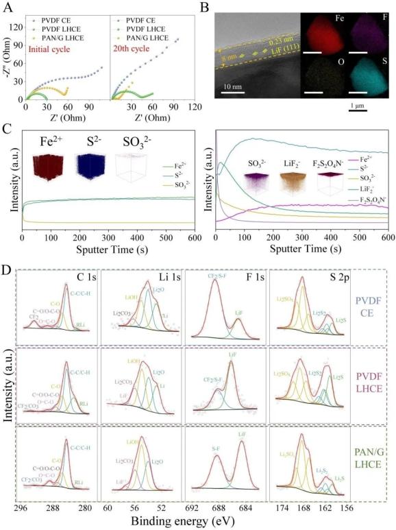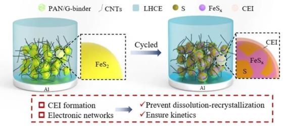设计思路:“电解液-粘接剂-导电剂”三合一构筑三维电子-离子导电网络。选择并优化局域高浓度电解液(LHCE,1.50 M LiFSI in DME/OFE/TTE)在FeS2颗粒表面构造富含无机组分的离子导体(CEI),可抑制放电产物多硫化物的溶解-再沉积,利用功能粘接剂聚丙烯腈和葡萄糖(PAN/G)的极性官能团实现与FeS2物理-化学强交联作用,并加入二维电子导体碳纳米管,可有效保障充放电过程中体积形变导致的电子通道通畅。