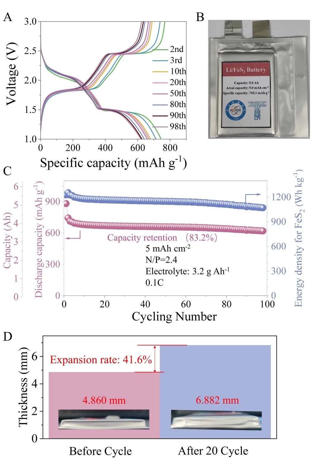 在N/P=2.4,电解液3.2g/Ah,正极极片压实3.0g/cm3条件下,制备了5 Ah的FeS2-Li软包电池,0.1C电流密度下,可实现循环98周,正极极片的能量密度为1229 Wh/kg。循环98周后,电池膨胀为41.6%。电池失效的主要原因为电解液干涸。同时,该工作也实现了转换反应型正极从材料-极片-电池的有效验证。