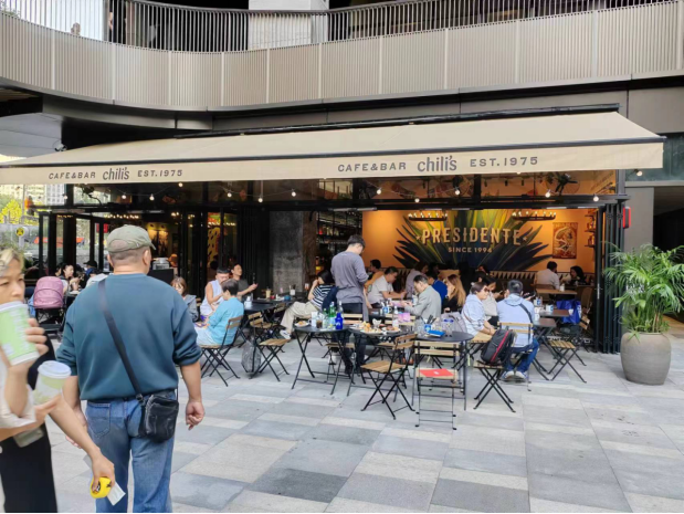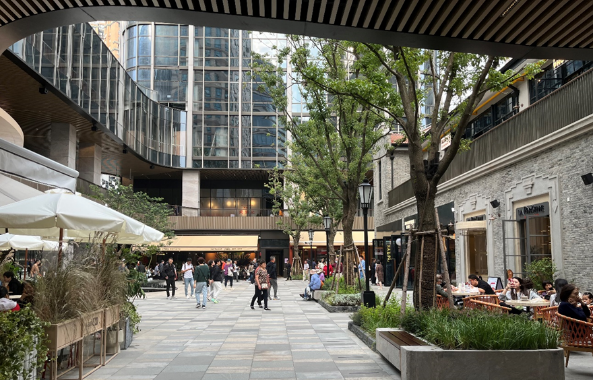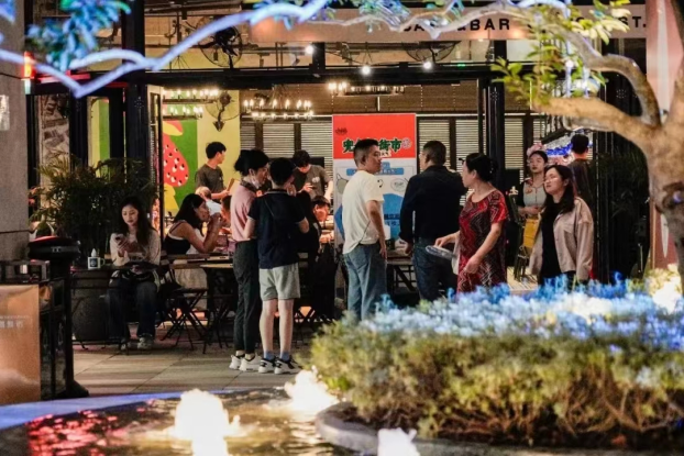 1. 人们从弄堂口步入开放式中央广场,沿街都是轻餐、咖啡、茶馆、快餐、网红冰茶,让人感到赏心悦目的是一路景观一路灯、喷泉、艺术展示,更多的是这些轻餐、咖啡、茶馆、快餐、网红冰茶外摆,色彩鲜艳的太阳伞与遮阳棚,下面的男男女女衣着时尚,手捧饮料、吃着点心;有的在玩手机,有的在热烈交谈;有的在凝视远方,有的正在发呆,形成了一条靓丽的风景线(见下图)。