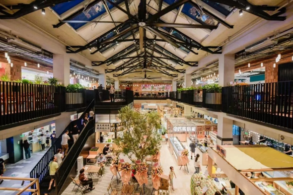 1. 自创自营的“菜市场”。凡是商业业内人士,不离口的是“主力店”,而“鸿寿坊”的主力店是瑞安餐饮管理公司自创自营的以MARKET PLACE为核心的“市集”。“鸿寿坊”的看点就在这个以生鲜食品为主的被称之为FOODIE PLAYGROUND市集,这是一个集场景与内涵皆优的市集天花板,笔者面见多个顾客惊叹这是上海所见的“最美菜市场”!来客们可以在这个5000平方米的菜市场里面停留很长时间,不仅可以看、玩、吃,还可以买得到居家所需的各式荤素菜,而且价钱还不贵。10月24日下午,笔者现场采访了一个黄姓女士,她告诉笔者她家就住在附近,自2023年9月28日开业以来她天天来买菜,菜品新鲜又实惠,价钱同别的菜场差不多,重要的是这里环境好,来这里逛逛,心旷神怡!