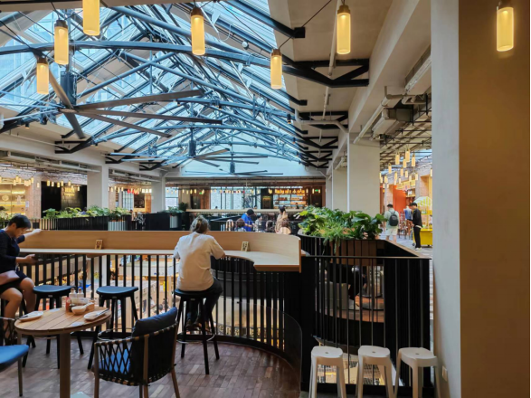 2. 人们从弄堂口步入,从前是回家而今天是购物、游憩和闲庭信步,而项目最有创新力的空间是FOODIE PLAYGROUND,以玻璃封顶,形成一个独立的挑高12米的大空间,市集分为两层,一层是菜场与混合独立的开放式店铺以及休憩的公共空间,二层设置了餐饮店铺并围绕中庭设置了就餐吧台,提升了餐饮的外摆以及展示面,让消费者感受到“随逛随歇”的宽松惬意体验(见下图)。