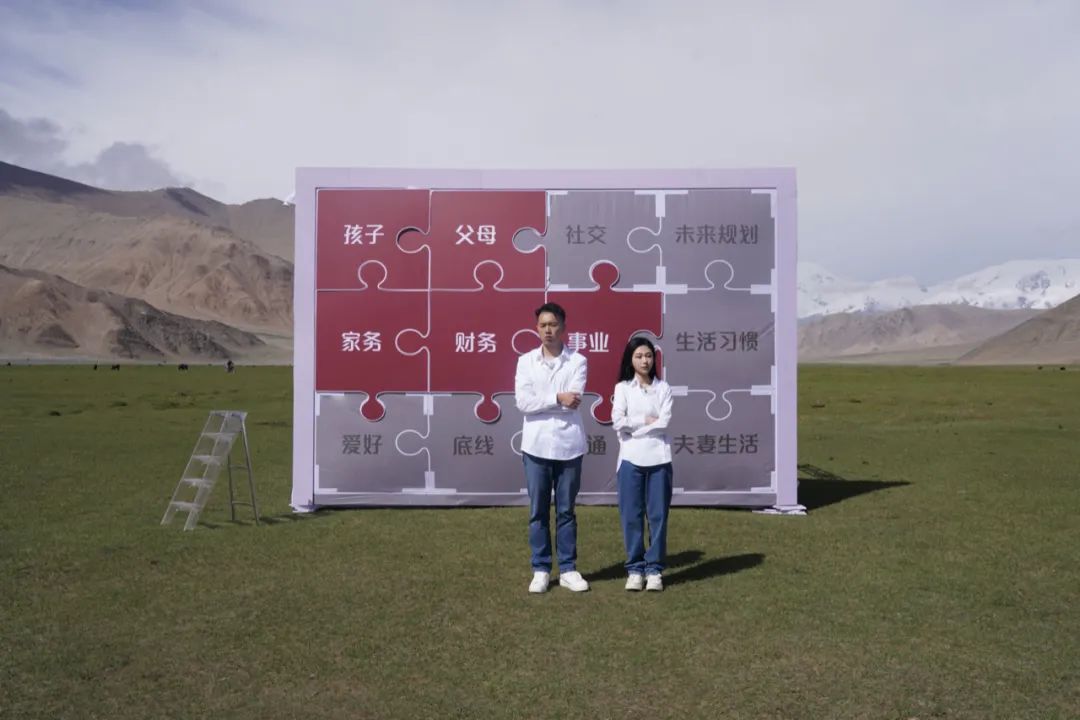 我设置了一个红色的背景墙,上面写着婚姻中需要达成共识的各种问题:财务、事业、孩子、家务、夫妻生活……本来设想是他们能共同克服这些问题,一起拼出完整的背景拍张结婚照,实际却发现他们产生了不少的分歧。