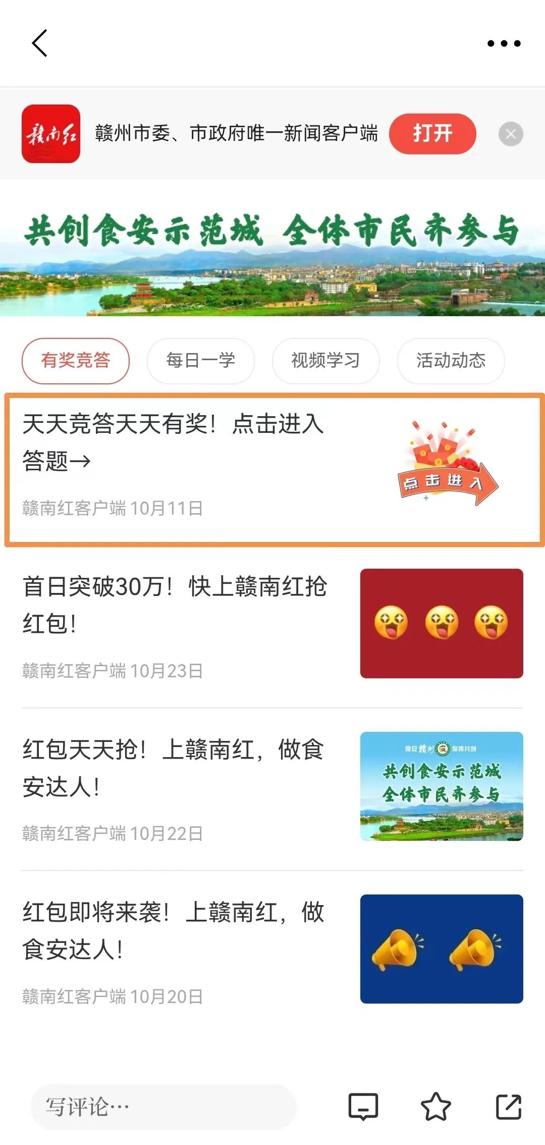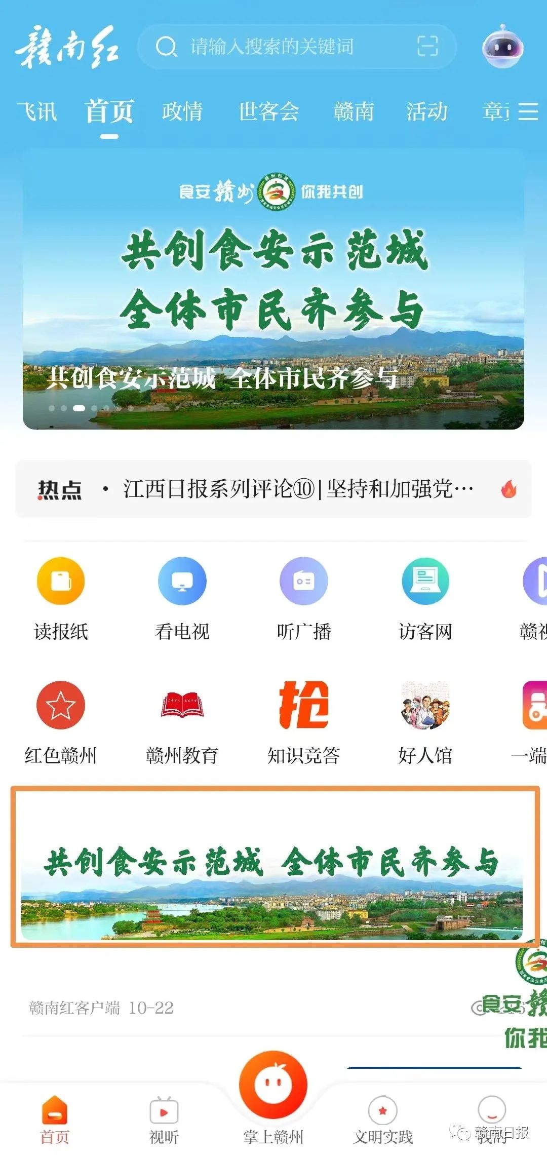 第二步打开赣南红客户端,点击“共创食安示范城 全体市民齐参与”专题;