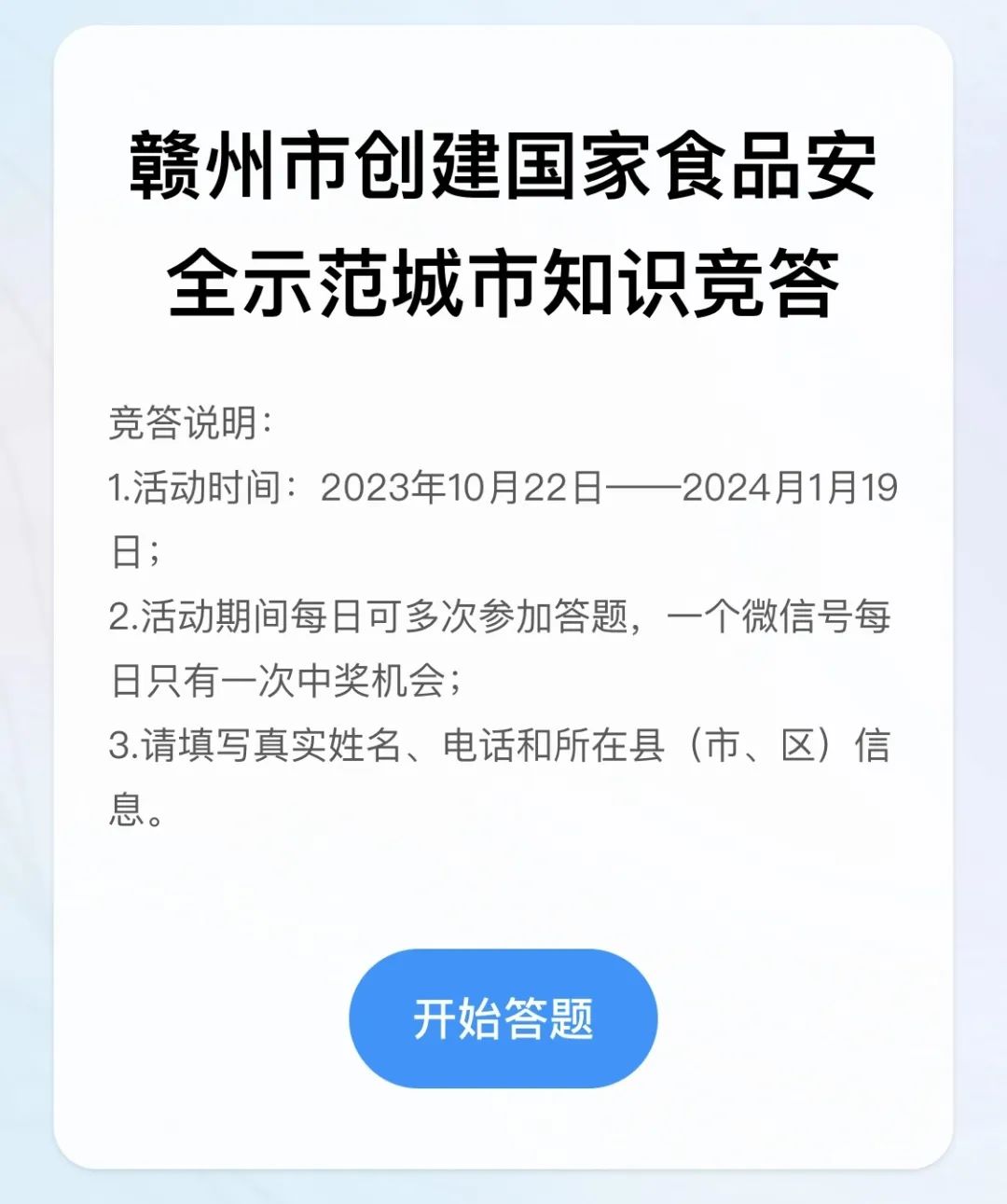 第三步进入答题页面后,点击【开始答题】,填好姓名、电话和所在县(市、区)信息后,即可参与知识竞答。