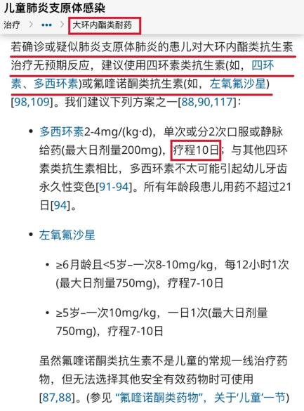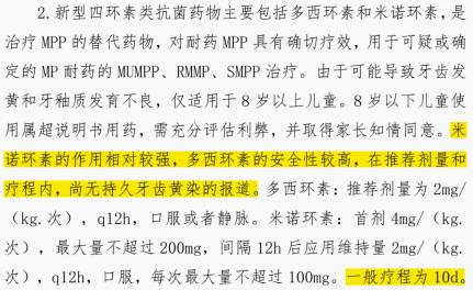 2、如果考虑耐药支原体肺炎(红框内容,这些患儿已经使用过大环内酯类抗生素,无预期疗效),多西环素疗程10天。