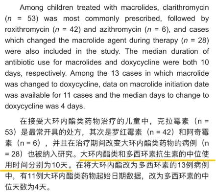 (https://www.ncbi.nlm.nih.gov/pmc/articles/PMC7921960/)这是2021年韩国儿科医生发表的一篇对比大环内酯类和多西环素治疗支原体肺炎疗效的研究,里面大环内酯类(克拉霉素和罗红霉素)和多西环素疗程都为10天。