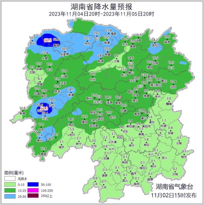全省来看,据湖南省气象台预计,3日至5日湖南有一次降温、降雨和风力加大天气过程,其中4日为最强降雨时段,湘西北部分地区有暴雨,风力加大至4~5级,局地阵风6级;过程累计雨量湘西北、湘南20~50毫米,局地可达70毫米左右,气温下降8~10℃,最高气温降至20℃左右,最低气温降至14℃左右;6日过程结束。