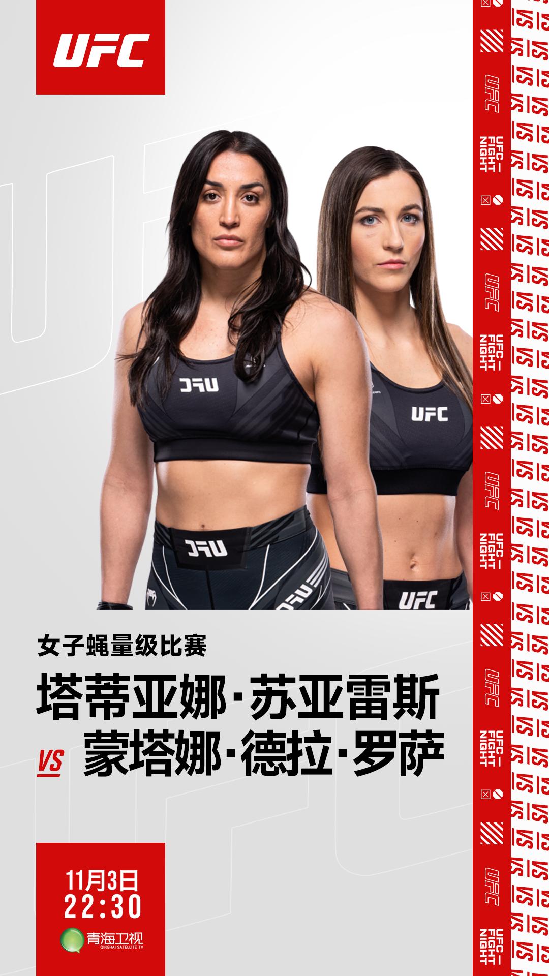 2023年11月3日 22:30,本期青海卫视《龙斗之UFC》将为大家带来UFC格斗之夜第220期,曾因伤休养四年之久的不败摔跤女将塔蒂亚娜·苏亚雷斯,将伤愈复出,对阵近年来崛起新秀蒙塔娜·德拉·罗萨。原标题:《她曾击败过三位UFC冠军级拳手,却因伤病暂别擂台4年!》