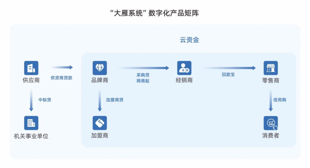 大雁系统是网商银行数字供应链金融解决方案,解决小微企业在供货回款、采购订货、铺货收款、连锁加盟等生产经营全链路的信贷需求及综合资金管理需求。目前已有超过1000家品牌接入大雁系统。