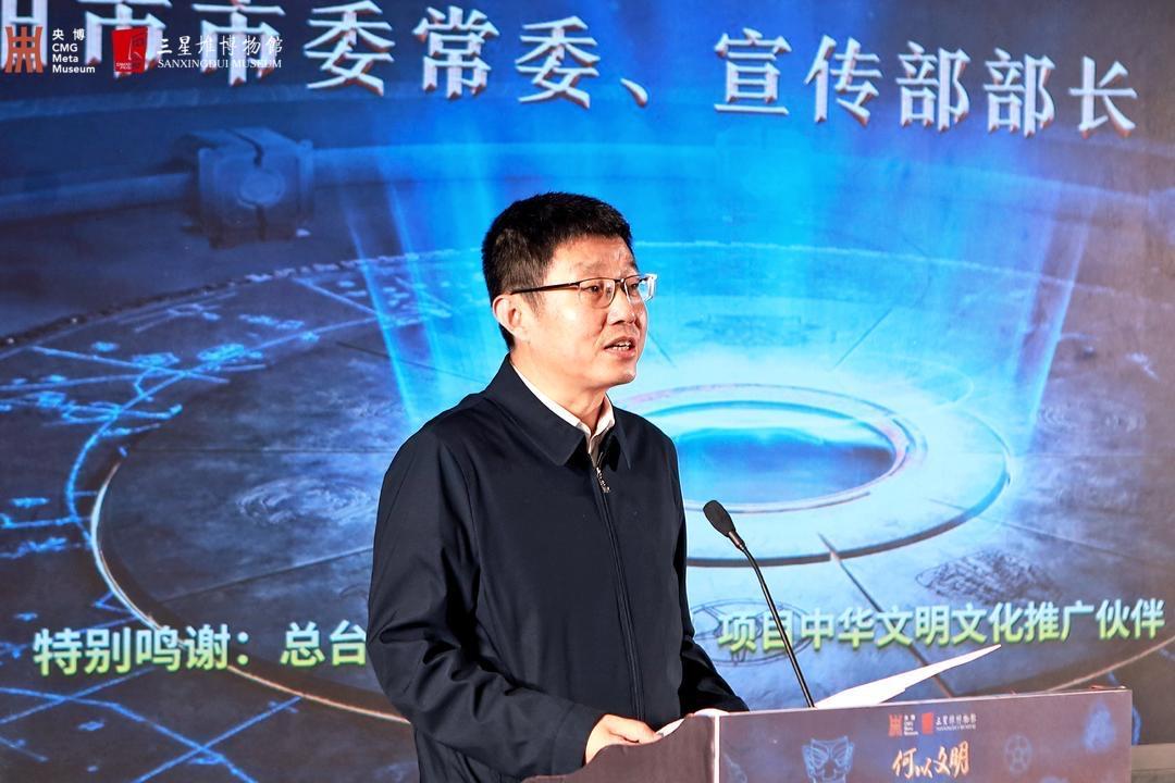 四川省德阳市市委常委、宣传部部长吴成钢吴成钢代表中共德阳市委、市政府,向三星堆又一重大文化成果的正式发布表示热烈的祝贺。他表示,三星堆是德阳最亮丽的文化名片,是展示德阳形象最重要的窗口。“何以文明 ‘古蜀之光——三星堆’”上线,是深入贯彻落实习近平总书记提出的“让收藏在博物馆里的文物、陈列在广阔大地上的遗产、书写在古籍里的文字都活起来”的生动实践。