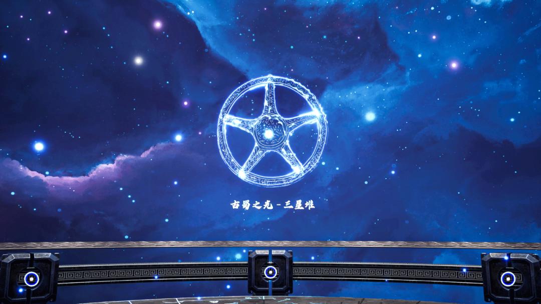 数字沉浸式展示区以 "跨越千年的相遇"为主题,划分《斗转星移》、《醒惊天下》、《五代传奇》、《寻味古蜀》、《一眼千年》五个篇章。《斗转星移》展示宇宙穿梭,星云变幻的时空。以线条方式展示宇宙穿梭,星空画面从中心向外扩散;《醒惊天下》以大立人等青铜人像类文物剪影+金杖青铜罍等器物类文物线描为内容元素。《五代传奇》以线描插画方式描绘五代蜀王时代相应文明。《寻味古蜀》展示豆类、稻、黍、稷、粟的金色丰收场景,田中散落装有粮食的青铜容器,夕阳下有收割粮食的人以剪影方式呈现。《一眼千年》则以纹样变换分形动画展示跨越千年的“对话”。沉浸展中纹饰不断变换直至宇宙尽头,化作一个亮光点,渐渐隐入眼睛中。
