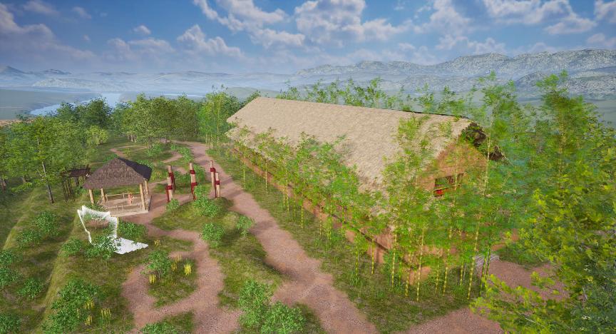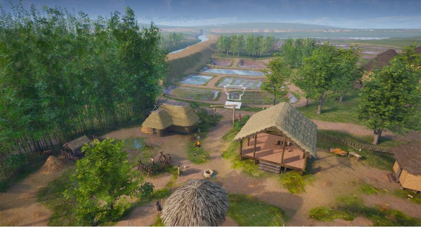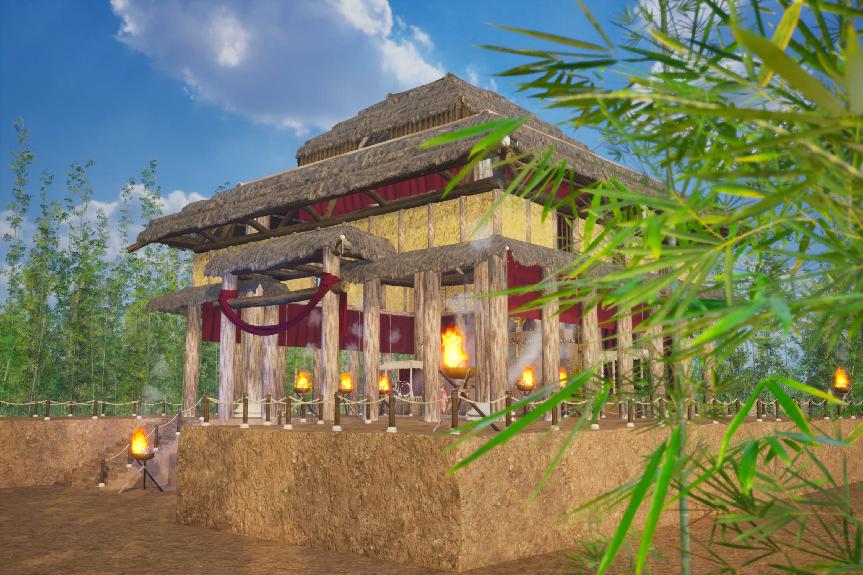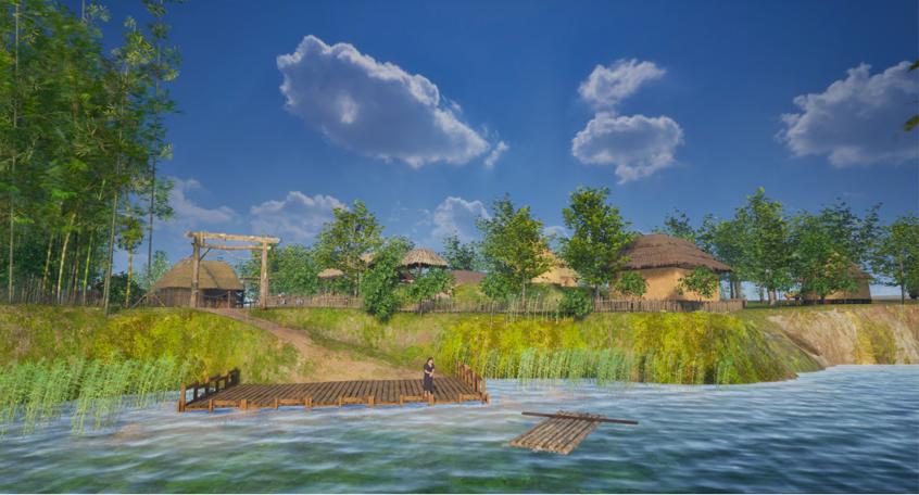 图 | “何以文明”大展复原“古蜀之光-三星堆”遗址之居住区湖光岛影,古树奇葩。巴山蜀水,尽收眼底!“央博”数字平台复原三星堆宫殿区、居住区、祭祀区三处遗址点,再现古蜀先民祭祀、朝见等历史场面。用户于指尖方寸感受时空交织,在欣赏蜀地秀丽风景的同时,亲身参与古蜀生活,与先民开启一场探寻中华文明之源的对话!