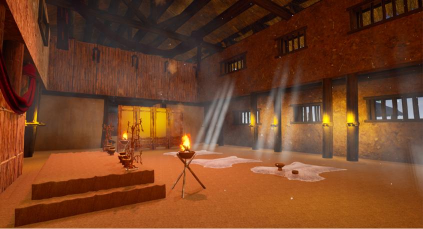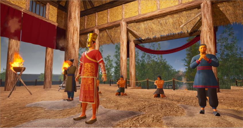 图 | “何以文明”大展NPC蜀王化身时空旅行者的用户,可以在复原的三星堆遗址场景内自由穿梭,通过传送门完成场景跳转。不同场景中,用户通过与NPC(“央博”数字平台复原的先民形象)对话、接收完成任务,沉浸式感受古蜀王国日常生活。