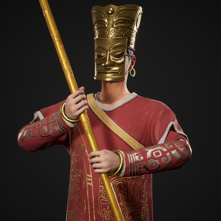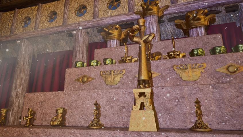 图 | “何以文明”大展复原十件核心文物在“古蜀之光”三星堆遗址中,青铜神树、金杖、青铜立人像等10件知名文物藏于其间。用户通过与NPC(“央博”数字平台复原的先民形象)对话,就能了解古蜀先民的文化信仰与神话传说,领略悠远历史的威严神圣。