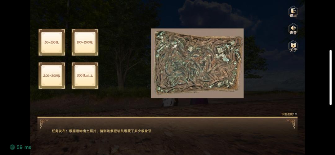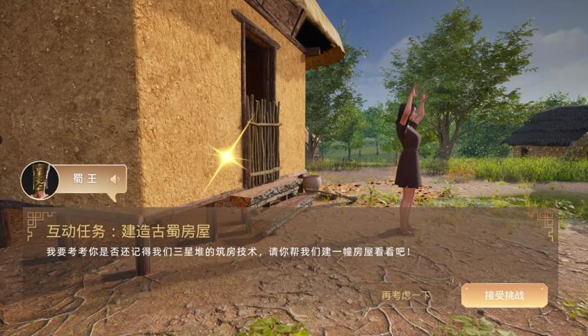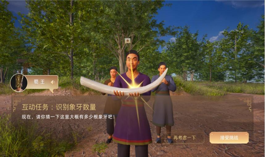 图 | “何以文明”大展“古蜀之光-三星堆”遗址之游戏在“央博”数字平台还原的三星堆遗址中,用户将参与识别象牙数量、建造古蜀房屋、寻找“璋”形象、点亮青铜神树四种游戏,并在与蜀王的对话中了解文化风俗与崇拜信仰。