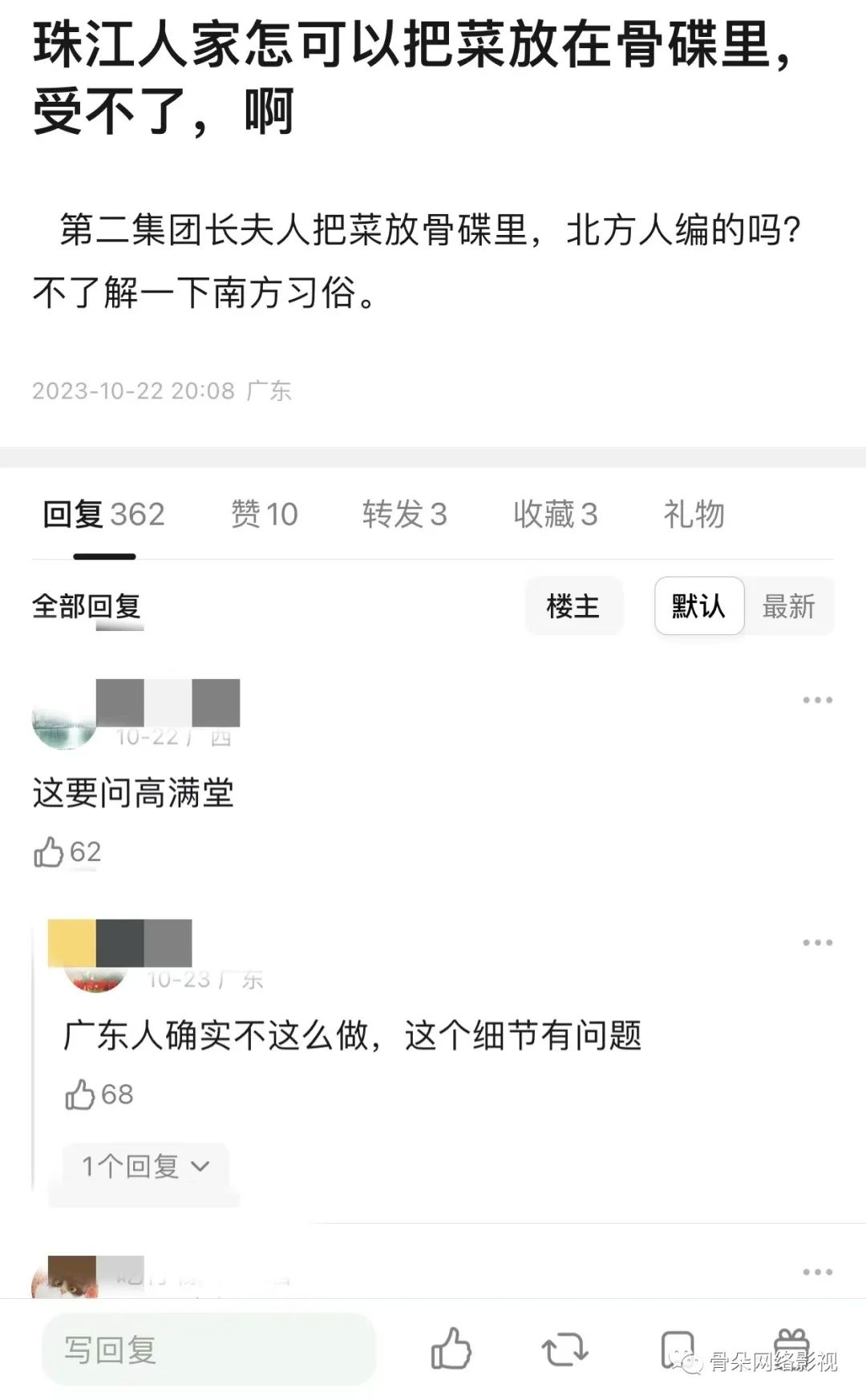 还有观众吐槽,《珠江人家》某一集里出现的一位广东军官太太,吃饭时把菜放在骨碟里,这种习惯根本不会出现在广东的餐桌上。骨碟在广东地区是用来放骨头和食物残渣的,用骨碟盛菜简直是触碰广东人逆鳞。