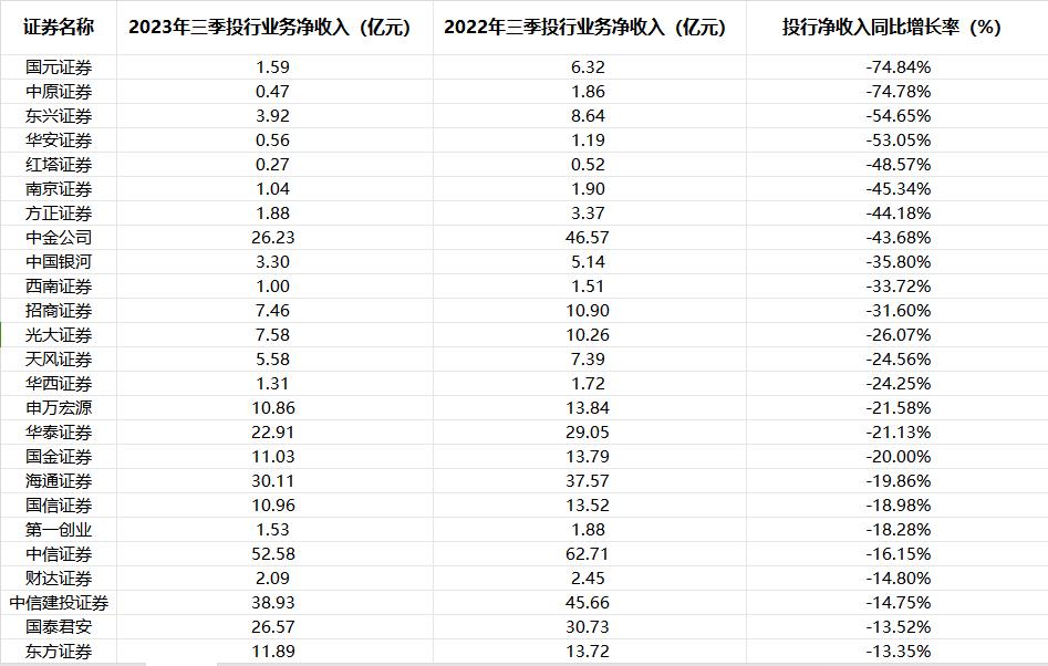 在投行收入普遍下降的情况下,也有多家券商实现逆市增长。中银证券前三季度投行净收入同比大增119%至1.57亿元,东北证券投行净收入同比增加96%至2.1亿元,财通证券投行净收入同比增幅超过62%至5.5亿元,浙商证券、长江证券等该业务也表现不错。