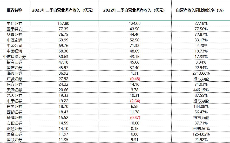 上市券商中,前三季度自营业务净收入超过20亿元的共计13家。中信证券以近158亿元领先全场,位列其后的国泰君安、华泰证券均约为77亿元。中金公司前三季度自营净收入略有下降,广发证券则“扭亏为盈”,由去年同期的-0.48亿元大增至27.92亿元。