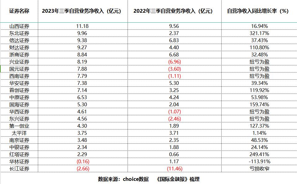 20家机构前三季度自营业务净收入低于10亿元,主要是中小券商。其中,长江证券前三季度自营净收入为-2.66亿元,相比去年同期亏损已大幅收窄;兴业证券、西南证券、华西证券等相比去年同期“由负转正”,东北证券前三季度自营净收入大增321%至9.96亿元。