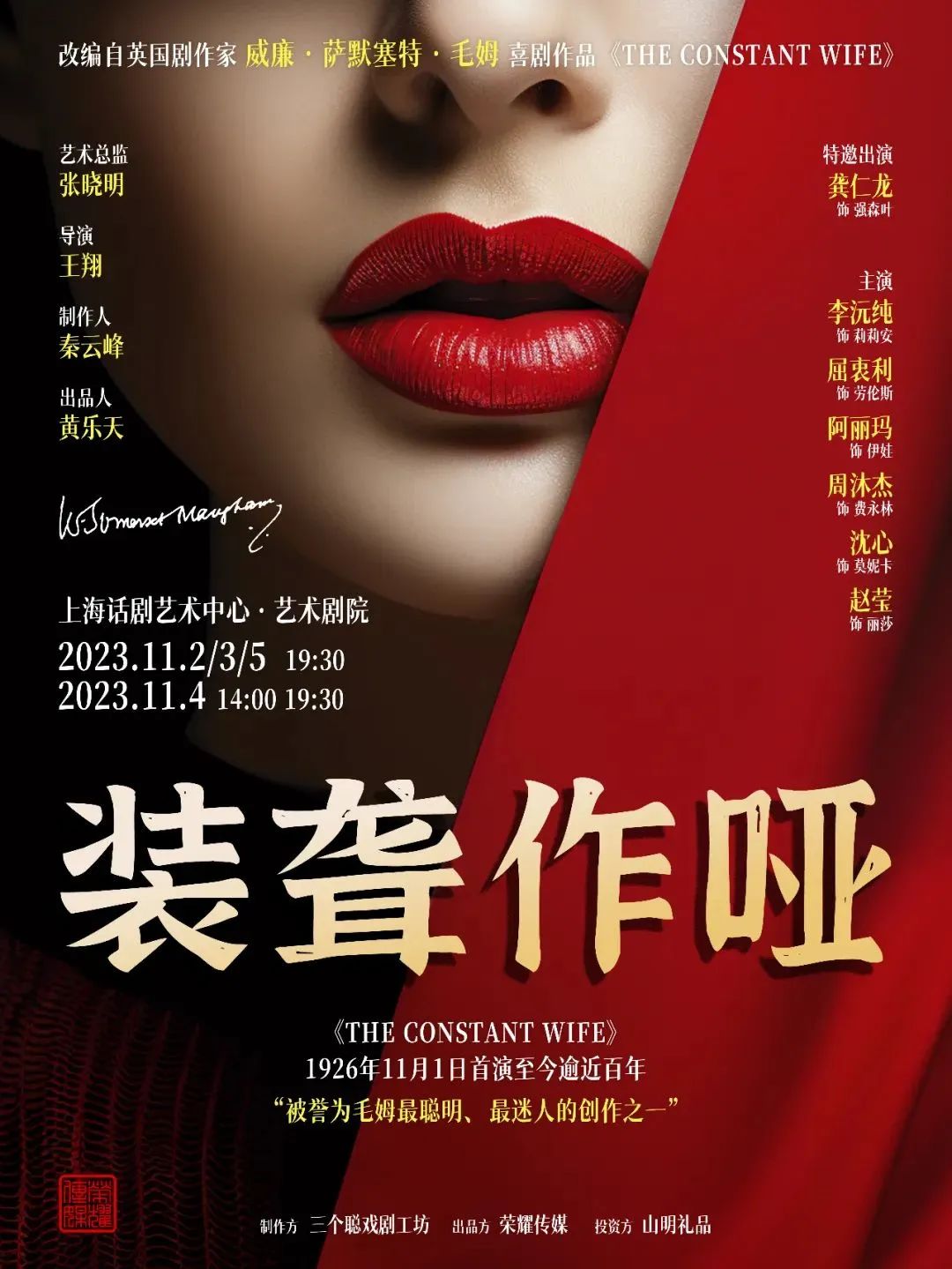 制作:三个聪戏剧⼯坊 | 出品:荣耀传媒 | 投资方:山明礼品 | 英⽂原著:《The Constant Wife》| 作者:威廉·萨默塞特·毛姆 | 艺术总监:张晓明 | 编剧:毛姆 | 导演:王翔 | 制作人:秦云峰特邀出演:龚仁龙