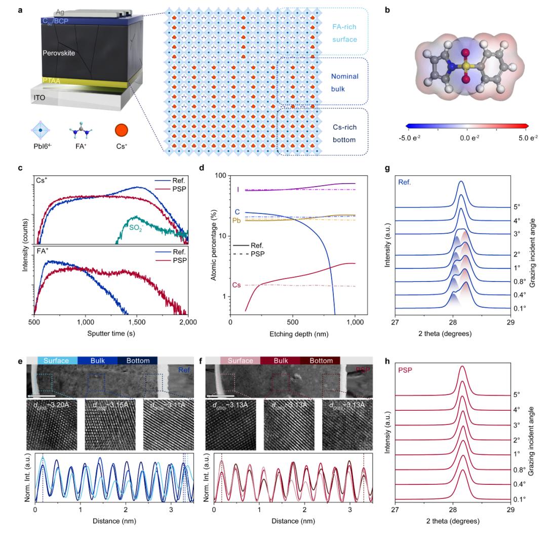 图1. 钙钛矿空间垂直的 FA-Cs 相分离:(a)由面外FA-Cs偏析引起的不均匀相分布图;(b)PSP的静电势(ESP)图像和分子结构;(c)对照样品和PSP器件的飞行时间二次离子质谱(ToF-SIMS)光谱阳离子分布;(d)基于深度XPS的原子百分比分布;对照样品(e)和PSP处理样品(f)的HAADF透射电子显微镜图像(比例尺参考:200nm);对照样品(g)和 PSP(h)处理的钙钛矿薄膜底部收集的GIXRD 光谱。