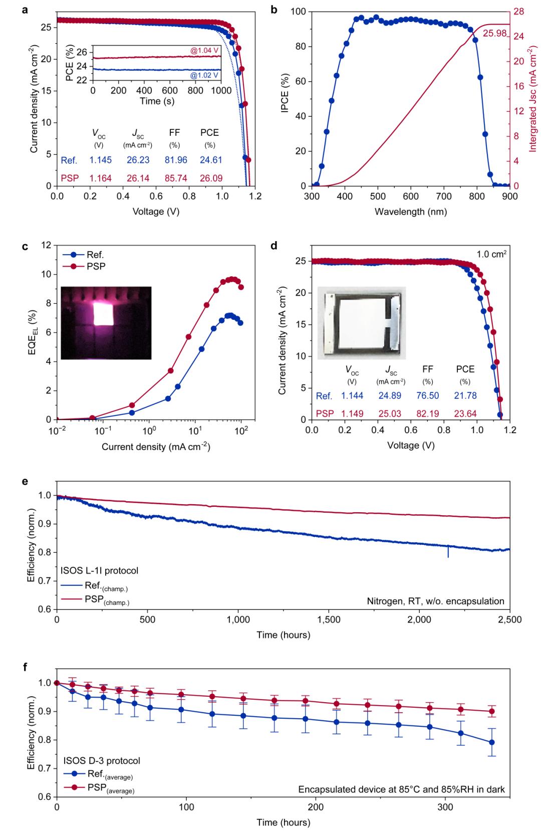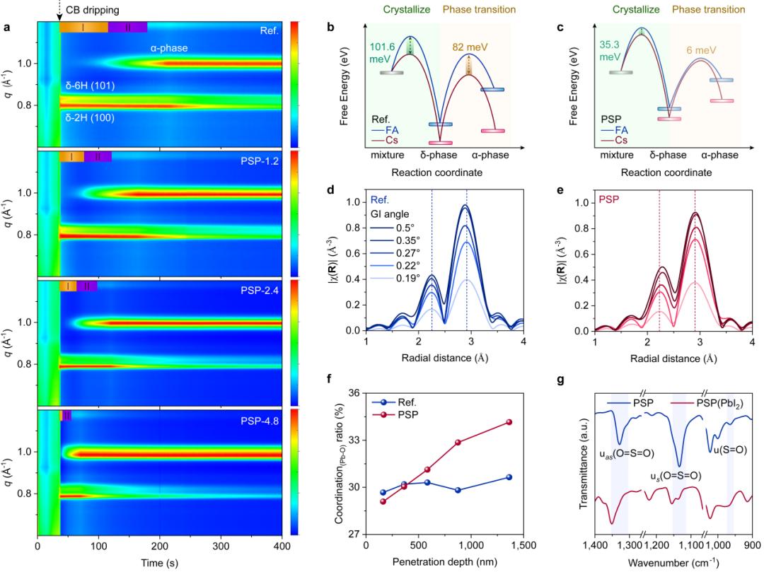 图2. FA-Cs相分离的起源:(a)原位同步辐射掠入射广角X射线散射(原位GIWAXS)图谱揭示了结晶和相变过程;对照样品(b)和PSP样品(c)在结晶和相变过程中自由能演化的计算结果示意图;(d-e)X射线吸收精细结构谱(EXAFS)测量的傅里叶变换R空间结果图;(f)根据EXAFS测量计算出的Pb-O配位比图;(g)PSP和PSP(PbI2)络合物的FTIR谱图。研究团队利用PSP策略制备的反式钙钛矿太阳电池获得了26.1%的最高效率,认证效率为25.8%。此外,经2500小时最大功率电追踪后(MPPT),未封装的器件仍保持其初始 PCE 的 92% 的可靠运行稳定性。该研究工作表明,通过均匀化钙钛矿组分面外分布可获得优异电池性能,开辟了提升电池器件稳定性的新途径,有望打破钙钛矿太阳电池的效率瓶颈,为进一步提升高效、稳定的钙钛矿太阳电池提供了明确的方向,对推动PSCs走向商业化发展具有重要意义。