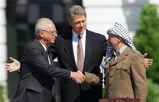 1993年,在时任美国总统克林顿的注视下,阿拉法特和当时的以色列总理拉宾签署《奥斯陆协议》。1993年9月13日,他与以色列总理拉宾在华盛顿共同出席了《加沙-杰里科先行自治协议》,即奥斯陆和平协议的签字仪式,从而拉开了政治解决巴勒斯坦问题的序幕。
