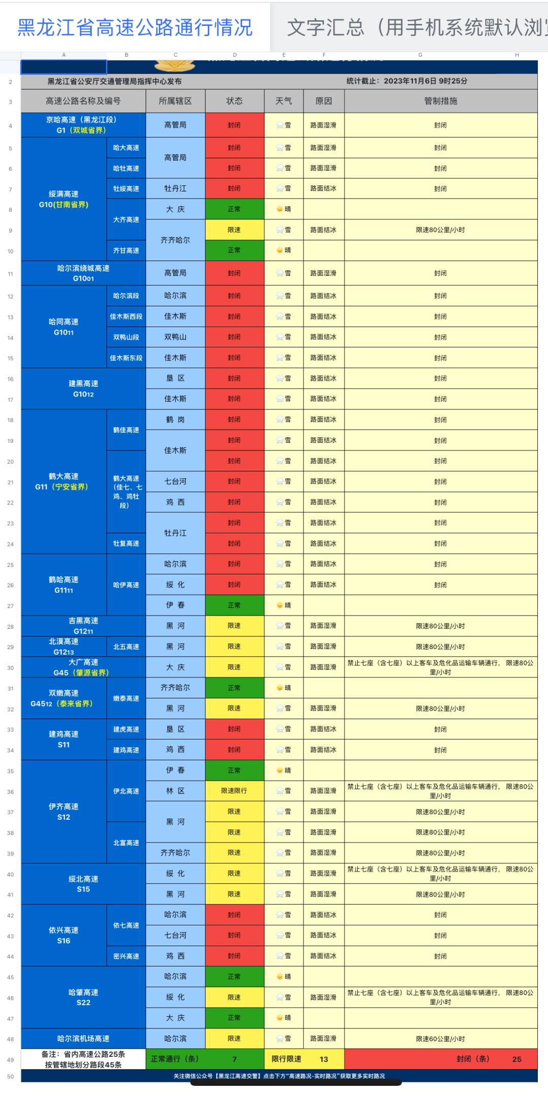 6日9时28分,记者从省公安厅高速公路交通管理局获悉,受降雪路面结冰影响,京哈、哈大、哈牡高速等25条高速封闭。哈尔滨机场高速限速60公里/小时,北五、北富等13条高速限速。