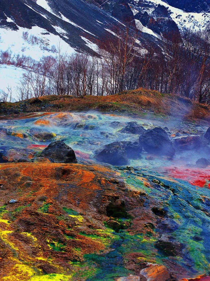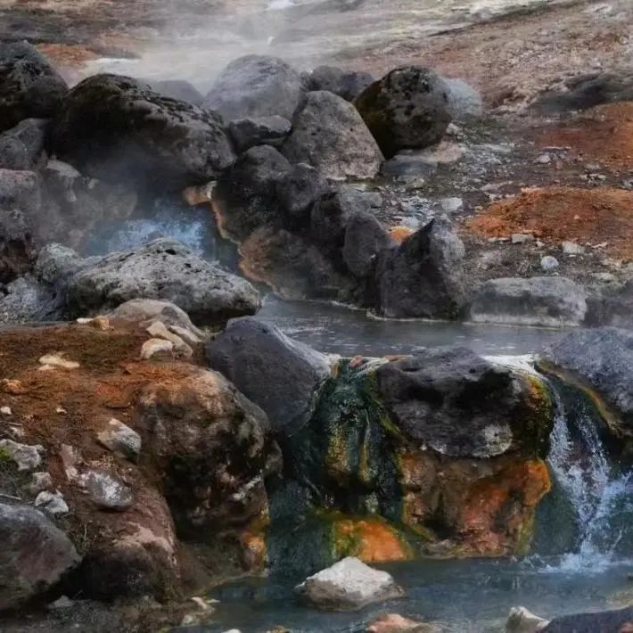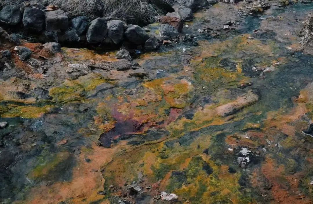 温泉附近常年沉淀下来的矿物质,有红、褚、黄、青、绿等等颜色,好似美丽的陶瓷。一种清淡的硫磺味在空气中飘浮。还有珍珠似的气泡冒出水面,吐出开锅似的声音。