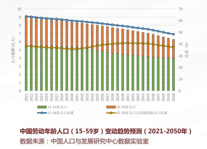 (三)劳动年龄人口规模和比重持续下降我国的15-59岁劳动年龄人口规模,2021年为8.98亿,2035年减少到8亿,2050年降至6.28亿,“十三五”时期平均每年减少280万人,从“十四五”起降幅逐渐扩大,“十四五”时期年均减少500万,“十五五”时期年均减少680万,2031—2040年期间年均减少约830万人、2041—2050年年均减少约1260万人。15-59岁人口占总人口的比重从2021年的63.60%降至2035年的57.96%、2050年的48.39%。劳动年龄人口中45-59岁壮年劳动力占比在2021—2034年期间保持在37%上下,此后上升至40%左右的平台期。