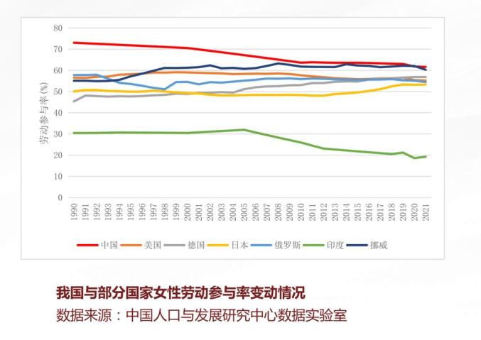 从国际比较看,我国15岁以上女性劳动参与率1990—2000年平缓下降,2000年以来下降幅度较为明显,从2000年的71%降至2021年的62%。需要注意的是,我国女性劳动参与率在世界上始终处于较高水平2021年略高于挪威( 60% )水平,显著高于美国 ( 55% )、俄罗斯( 54% ) 、德国( 57% )、日本( 53% )、印度( 19% )水平。