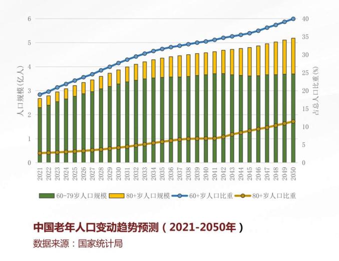 (四)“十四五”起人口老龄化开始加速受20世纪60年代出生高峰期人口进入老年阶段的影响,从2022年开始,我国60岁及以上老年人口将快速增长,2021至2030年期间年均增加1300万以上,远高于“十三五”年均740万的增幅,2025年达到3.21亿,2032年突破4亿,2048年突破5亿。60岁及以上老年人口占比,2021年为18.93%,2023年时超过20%,2033年达到30%,2050年将接近40%。