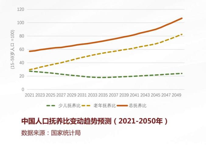 (五)人口抚养比不断提高从当前至本世纪中叶,少儿抚养比的变动幅度较小,从2021年的27,降至2035年的18,此后逐步增加至2050年的24。由于劳动年龄人口规模不断减少和老年人口规模持续上升,老年抚养比快速增加,从2021年的30,增至2025年的37、2035的55、2050年的83,带动总抚养比快速增加,到2050年我国总抚养比将达到107,也就是说每100个15-59岁劳动年龄人口将抚养107个老年人口和少儿人口。