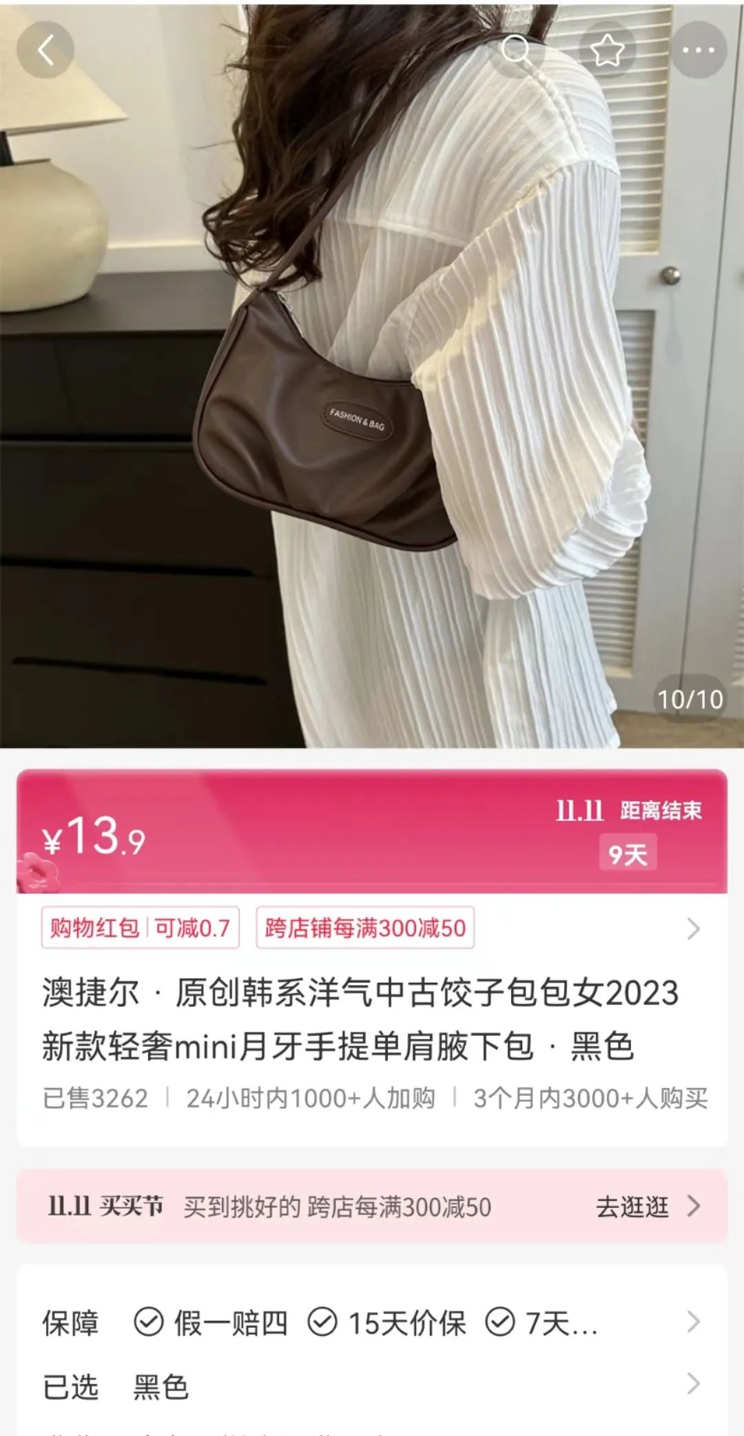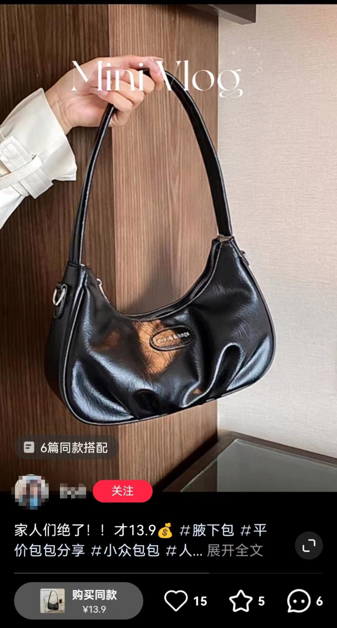视频中,博主展示了一个看上去简约大方的黑色腋下包,质感不错,反光油亮,甚至颇有些仿大牌包包的版式。不过,左下角的价格显示,包包的价格仅为13.9元。